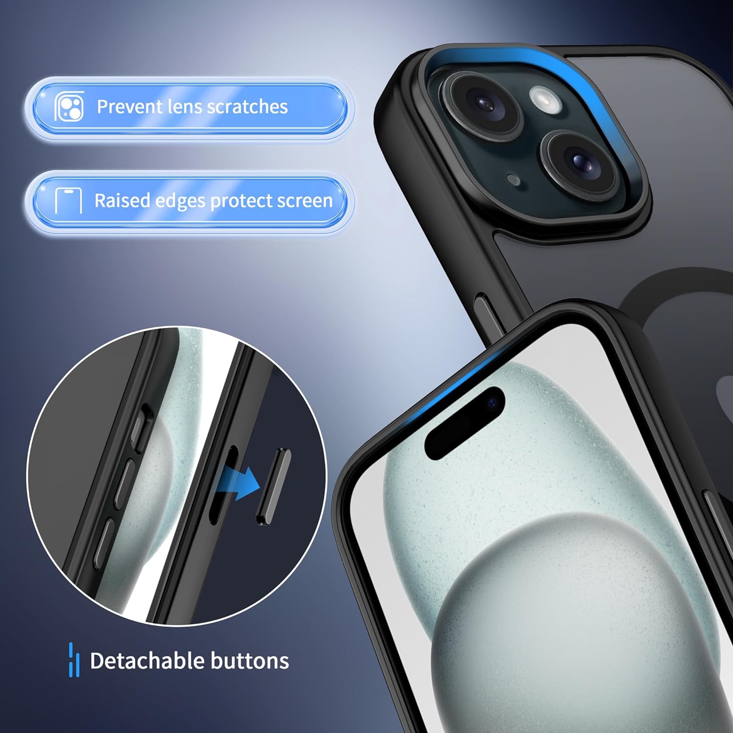 - [Raised Screen & Camera Safeguard] This iPhone 15 iPhone case provides a 2.5 mm raised camera lip and a 1.2 mm raised screen lip with exclusive built-in camera airbags, It can protect your iPhone against everyday scratches and bumps to keep your iPhone‘s display and photos flawless.
